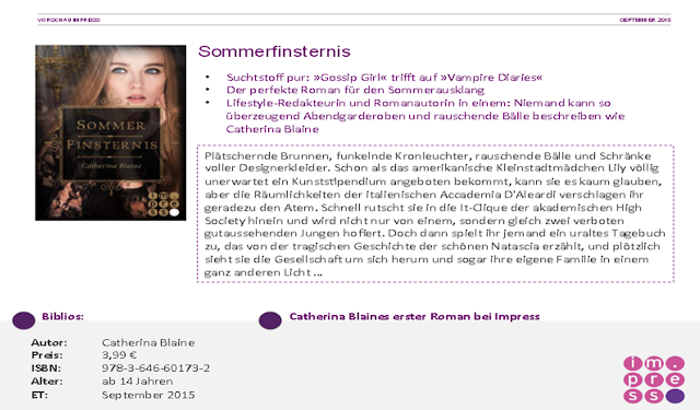wie jeden Monat habe ich ganz frisch für euch die neuen Impress-Titel. In der Vorschau und bei Facebook habe ich die Neuerscheinungen aus dem September entdeckt, welche am 03.09.2015 erscheinen werden. Wie jeden Monat sind wieder wunderbare Bücher dabei :)! Im August kommen auf jeden Fall neue Reihen bzw. auch Reihenabschlüsse auf uns zu, sowie eine E-Box ♥.